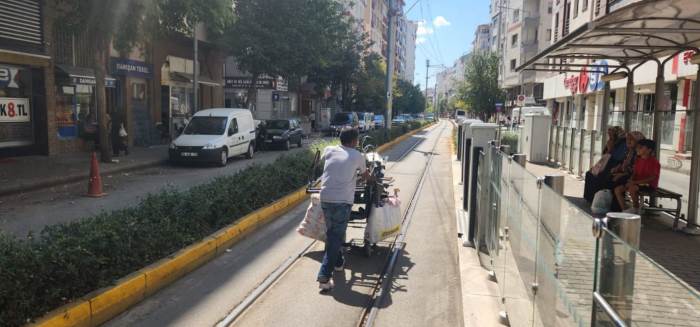 Eskişehir'de olası kazaların önüne geçmek amacıyla güvenlik korumalarıyla çevrelenen tramvay yolları, vatandaşların duyarsızlığı ile tehlike oluşturuyor. Araç sürücülerinden bisiklet kullanıcılarına kadar pek çok kişinin tramvay yollarını kullanması özellikle vatmanlar tarafından uyarı alırken, bir başka görüntü de Mamure Mahallesi’nden geldi. Hurda aracını tramvay yolundan hareket ettiren bir vatandaş da tramvayın gelmesi halinde kaçabileceği bir nokta bulunmamasından dolayı kazaya davetiye çıkarıyor.