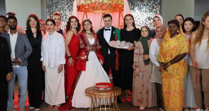 Damat Çağatay Pamuk ise düğünlerinde farklı bir anının oluşmasıyla mutluluk yaşadığını belirterek, “Çok mutluyuz, çok heyecanlıyız. Bugünlerde mutlu olduk. Yabancı öğrenciler de bizim kültürümüzü öğreniyor, görüyor ve mutlu oluyoruz” ifadelerini kullandı.