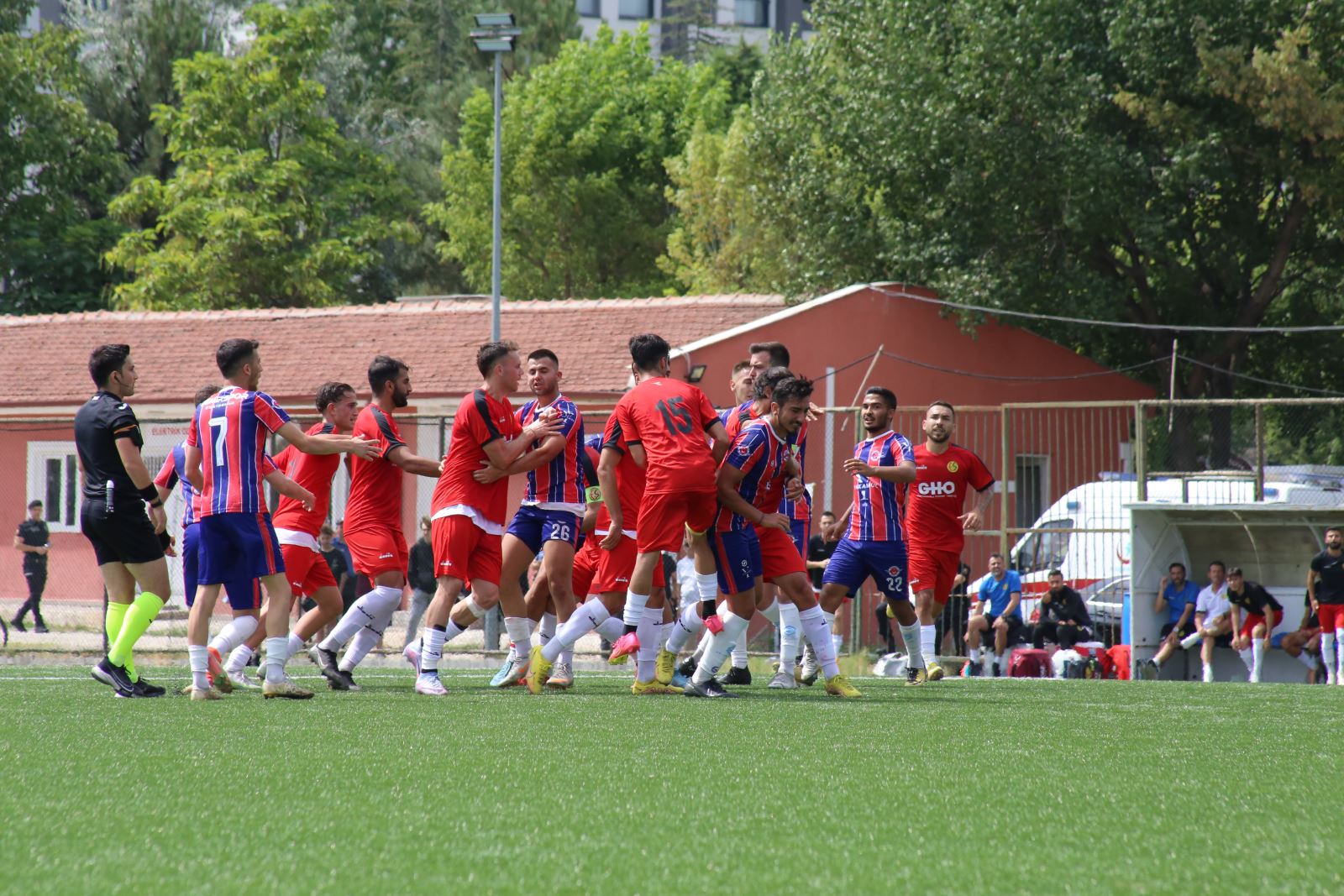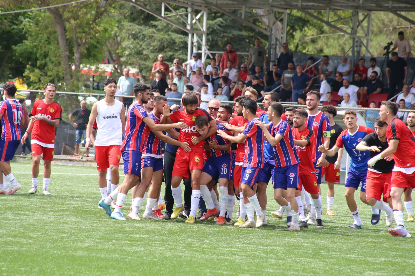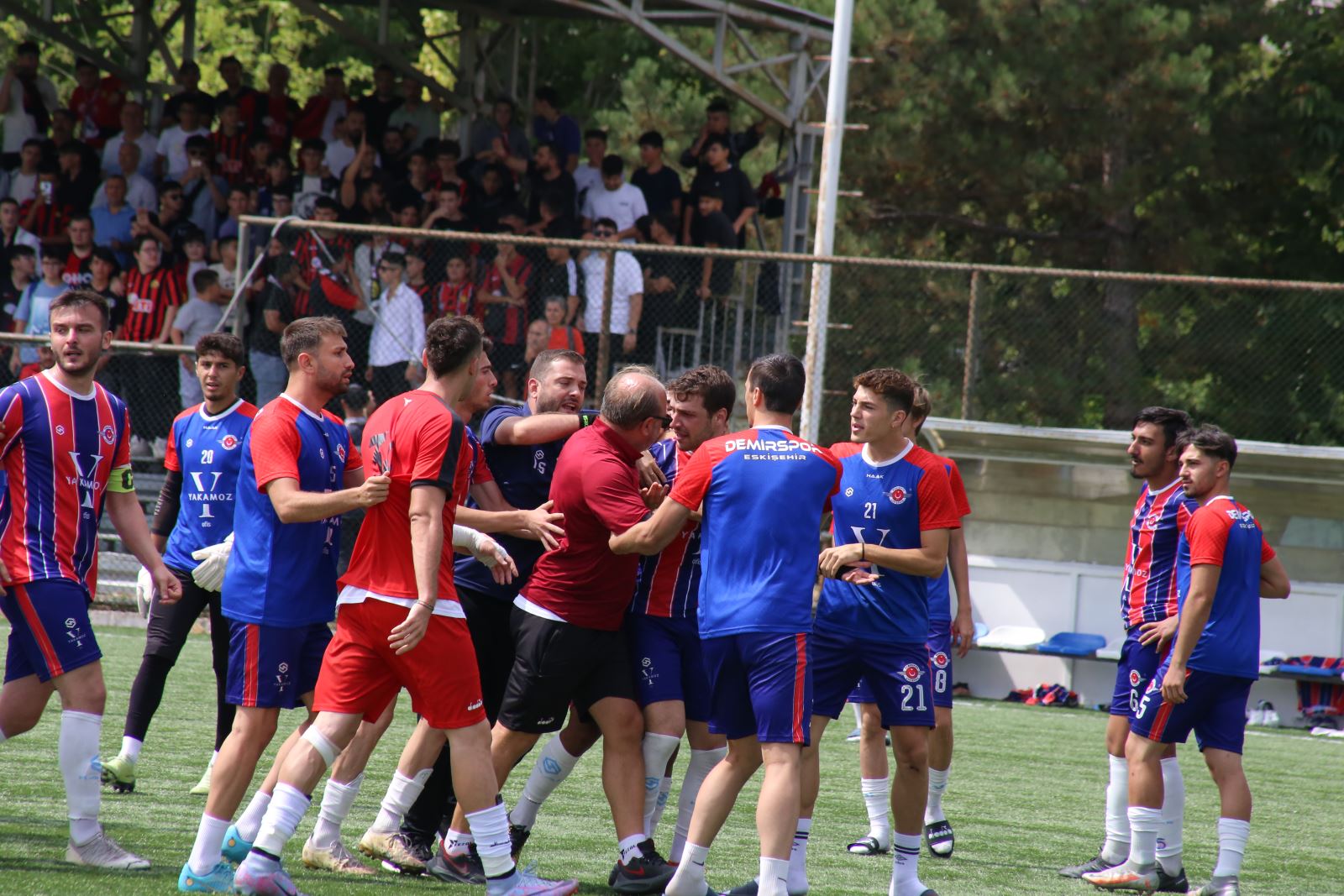 Yaşanan tartışma arbedeye döndü. Eskişehirspor’un forveti Ercan Kuruçay’ın Demirspor’un savunma oyuncusu Buğra Cesur’a fiziki müdahalede bulunmasıyla saha içi iyice karıştı. Doğukan Bülbül ve Serdar Sudun’un Demirsporlu Onurhan Uyanık’a Dozu bir hayli aşan tepkisi vardı. Her iki takımın teknik ekibinin sahaya girmesiyle birlikte olaylar çok fazla büyümeden yatıştırılsa da bu görüntüler iki Eskişehir takımına da yakışmadı.