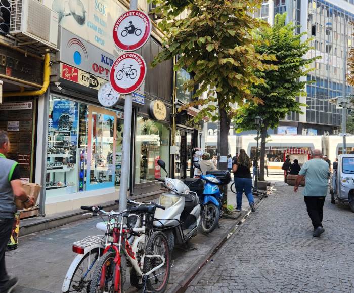 Trafik düzenini sağlamak amacıyla konulan levhaya uyulmaması, sokakta karmaşık görüntülere neden oldu. Yayaların yoğun kullandığı bölgede bisikletlerin park halinde bulunması geçişleri zorlaştırıyor.
