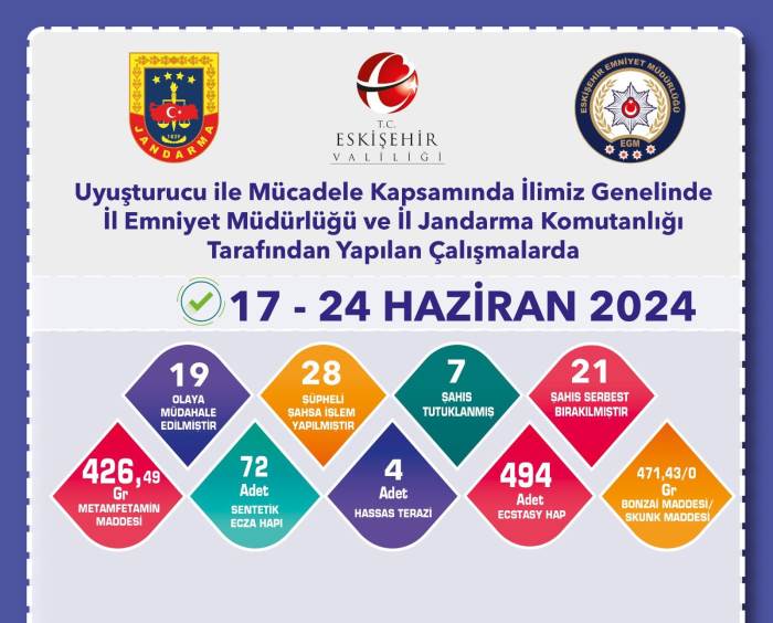 Edinilen bilgiye göre, uyuşturucu ile mücadele çerçevesinde İl Emniyet Müdürlüğü ve İl Jandarma Komutanlığı tarafından çalışma yapıldı. İl genelinde 17-24 Haziran tarihleri arasında gerçekleştirilen çalışmalarda 19 olaya müdahale edildi. Çalışmalar sonucunda 28 şüpheli şahsa işlem yapılırken, 7 şahıs tutuklandı ve 21 şahıs serbest bırakıldı. Ayrıca ekiplerce 426,49 gram metamfetamin maddesi, 72 adet sentetik ecza hapı, 4 adet hassas terazi, 494 adet ecstasy hap ve 471,43 gram bonzai ele geçirildi.
