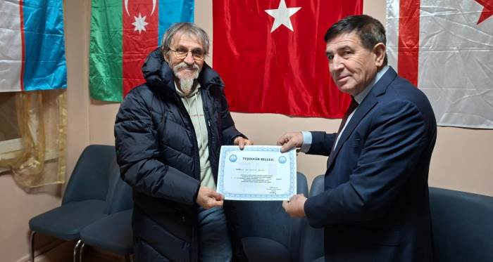 Konferansın sonunda Eskişehir Kızıl Elma Turan Derneği Başkanı Ahmet Hızlan, verdiği bilgiler dolayısıyla Opr. Dr. Hüseyin Seçkin’e teşekkür ederek plaket ve teşekkür belgesi takdim etti.