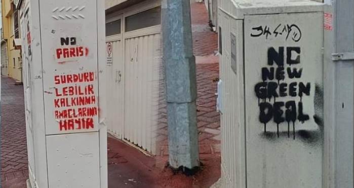 Eskişehir Tepebaşı ilçesi Güllük Mahallesi Yüzügüllü Sokak’ta bazı elektrik panolarına ‘no new green deal’, ‘no paris’ ve ‘sürdürülebilir kalkınma amaçlarına hayır’ şeklinde yazıların yazıldığı görüldü. Kentin çeşitli bölümlerinde de bu türden yazıların duvar ve elektrik panolarında yer aldığı görülürken, yazıların kim ya da kimler tarafından yazıldığı ise bilinmiyor. Vatandaşlar tarafından merak uyandıran yazıların Avrupa Yeşil Mutabakatı’na karşı yazıldığı tahmin edilirken, çevre sakinleri ve yoldan geçenler, görüntü kirliliğine sebep olan yazılara tepki gösteriyor.