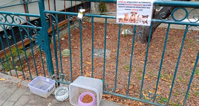 Eskişehir’in Adalar bölgesinde sokak hayvanları için ayrılan bir noktada kedi maması ve su kaplarının yer aldığı görüldü. Demir korkuluklara asılan yazıda, kedilerin himaye altında olduğu belirtilerek çevredekilere uyarıda bulunuldu. Uyarı yazısında, vatandaşlardan kendi tüketmedikleri gıdaları bu alana bırakmamaları istenirken, kediler için her zaman mama bulunduğu bilgisi paylaşıldı. Alanın çevresinde mama ve su kaplarının düzenli şekilde yerleştirildiği dikkat çekti. Bölgedeki bu düzenlemenin, sokak hayvanlarının beslenmesine yönelik bilinç oluşturmayı amaçladığı görülürken, Adalar çevresinde benzer noktaların bulunduğu ifade ediliyor.