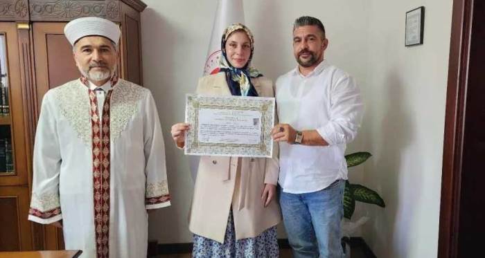 İhtida merasimi, yapılan dualarla son buldu. İl Müftüsü Gül, yeni Müslüman olan Aleyna’ya Diyanet İşleri Başkanlığı tarafından hazırlanan Almanca İslam kitapları ve ihtida belgesi takdim etti. Bu anlamlı etkinlik, toplumsal birlik ve hoşgörünün önemini bir kez daha vurguladı.