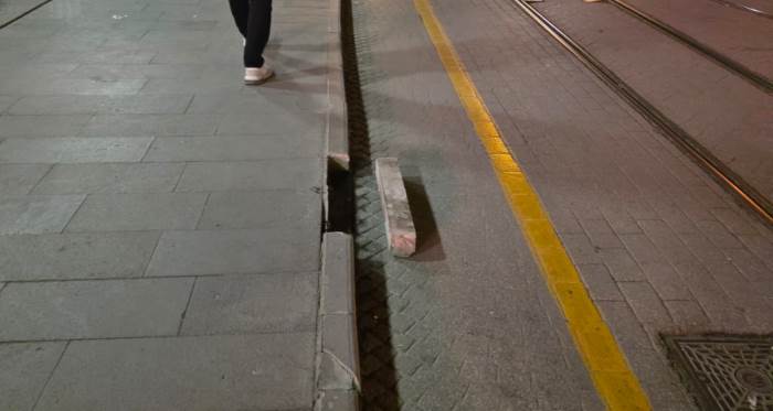 Tramvay hattına yakın bir noktada bulunan hasarlı bordür taşının, belediye ekiplerince bakımının yapılması isteniyor. Parçalanmış taşın yola eğimli durması, bisiklet ve scooter kullanıcıları için ayrı bir risk oluşturuyor.