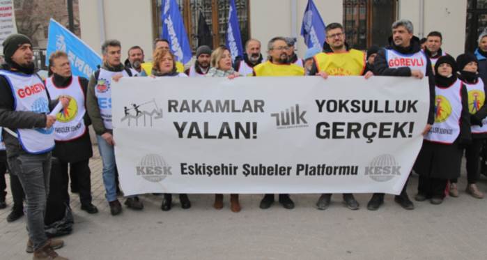 KESK Şubeler Platformu üyeleri bir araya gelerek ‘insanca yaşamaya yetecek ücret istiyoruz’ çağrısı yaptı. Platform adına açıklama yapan Uygar Kurtcu, “Gelin yıllardır tekrarlanan bizi her geçen gün daha sefalete iten bu oyuna artık dur diyelim. Ne TÜİK’in sahte enflasyon rakamlarına ne iktidarın ‘refah payı’ aldatmacalarına kanmayalım” dedi.