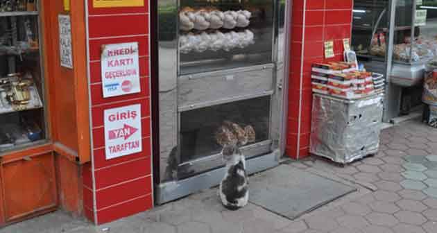 Kentin işlek bölgelerinden biri olan Sivrihisar caddesinde bulunan bir kasap dükkânının vitrinindeki etleri izleyen kedi yoldan geçenlerin gözüne çarptı. İşletmenin önünü adeta mesken eden sevimli hayvan, dakikalarca dönen etleri seyretti. Görenleri güldüren kedi, yoldan geçen vatandaşların meraklı bakışlarına rağmen gözlerini hiç ayırmadan vitrini izledi. Sevimli hayvan, çevredekilerin kendisine sevgi göstermesine rağmen dükkânın önünden uzun süre ayrılmadı.