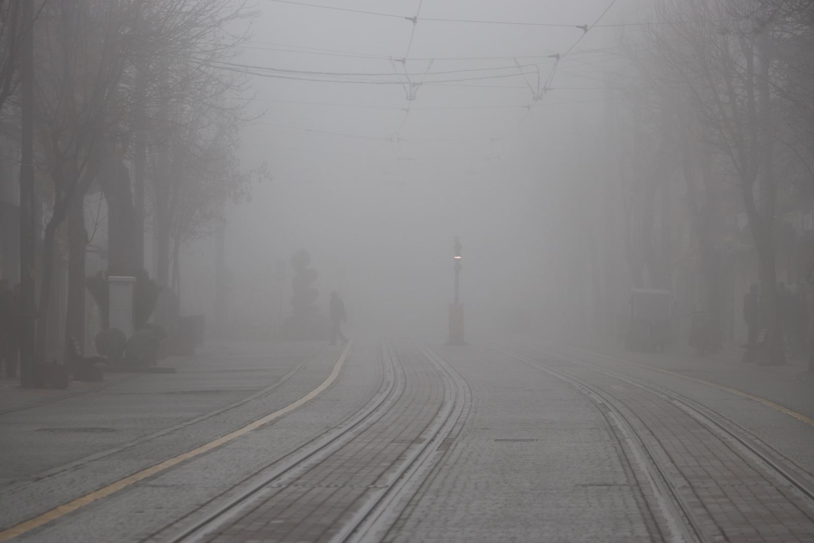 Eskişehir’de pazar sabahı etkili olan yoğun sis, kent genelinde görüş mesafesini düşürürken tramvay hatlarında ve sokaklarda kartpostallık görüntüler ortaya çıkardı.