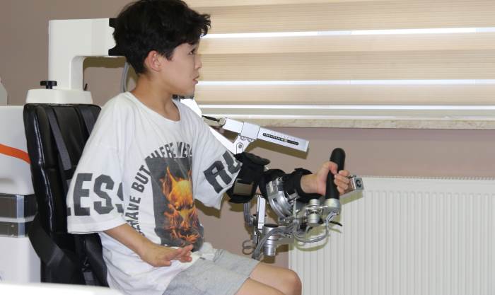 Emirkhan Bekmurzaev hakkında konuşan Tıp Merkezi Tıbbi Direktörü Uzm. Dr. Türkan Tünerir, “Serebral palsi tanısıyla merkezimizde sağlık turizmi kapsamında tedavi gören bir hastamız. Buraya üçüncü gelişi. Hastamız 2 buçuk yaş civarında yürüyebilmiş ama yürümeye başladıktan sonra da çok sık düşmeleri olmuş ve düzgün yürüyememe şikâyeti vardı. Bize ilk geldiğinde 4 yaşındaydı. O zaman kendisine yoğun bir terapi programı düzenledik. Özellikle yürüme egzersizlerine yönelik. Hastamız çok güzel yürüdü, hatta bulunduğu şehirdeki okulda futbol takımına girdi, orada koşmaya başladı. Daha sonra üst ekstremite de kuvvetsizlik ve ellerinde ince motor becerilerindeki zayıflık nedeniyle tekrar geldi. O dönemde de güzel, yoğun bir tedavi uyguladık, üst ekstremite tedavisi ve gövde kaslarına kuvvetlendirme yaptık, onda da güzel gelişim gösterdi. Yeniden merkezimize gelmeyi tercih etti. Şimdi hem gövde kaslarını geliştiriyoruz hem de solunum kapasitesini arttırıyoruz” dedi.