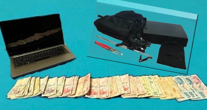 Yapılan aramalarda şüpheliden; 1 yazar kasa, 1 kar maskesi, 1 demir sac kesme makası, 1 yan keski, 1 levye, 1 laptop, 1 elektronik tablet, 6 bin TL para ele geçirildi.