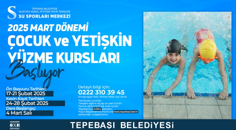 Eskişehir Tepebaşı Belediyesi, 2025 Mart dönemi yüzme eğitimleri ve çeşitli kurslar için kayıtları başlattı.