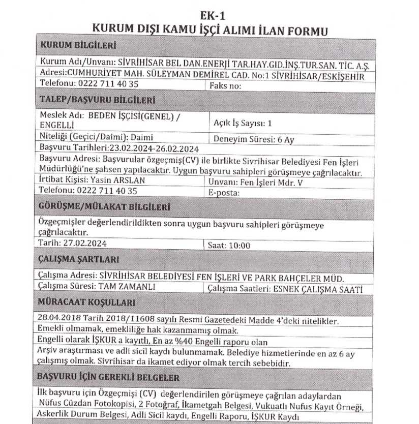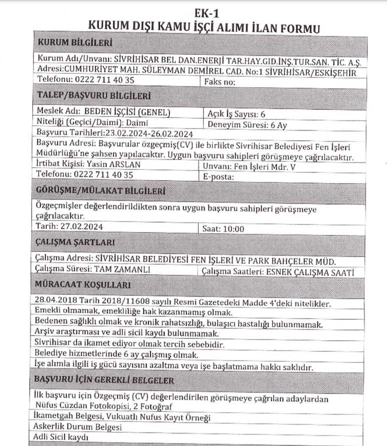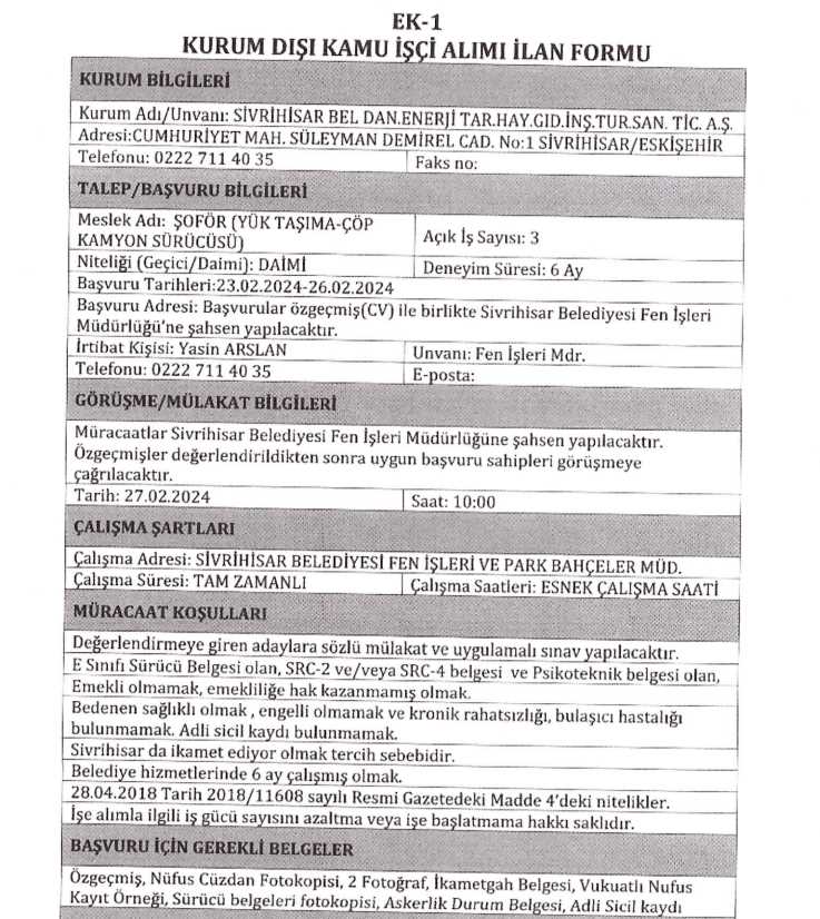 Eskişehir'de Sivrihisar Belediyesi'nde çalışmak üzere işçi ve personel alımı yapılacağı duyuruldu.