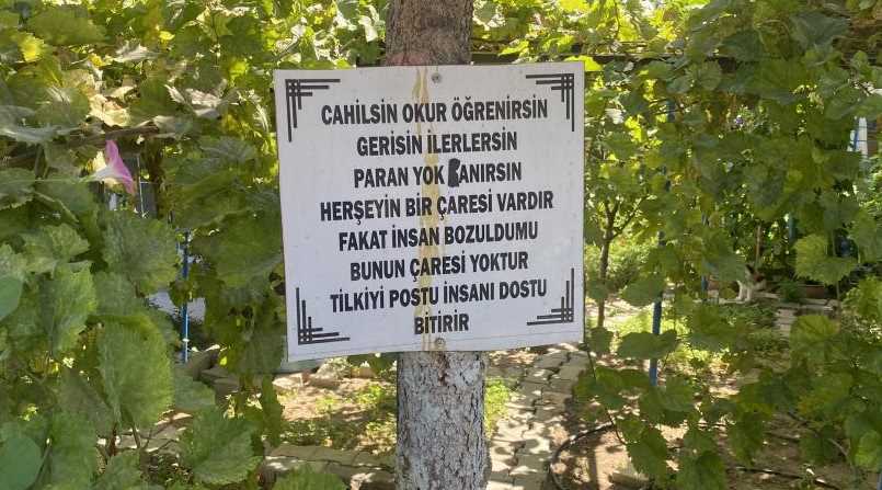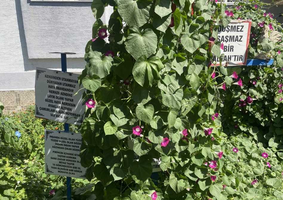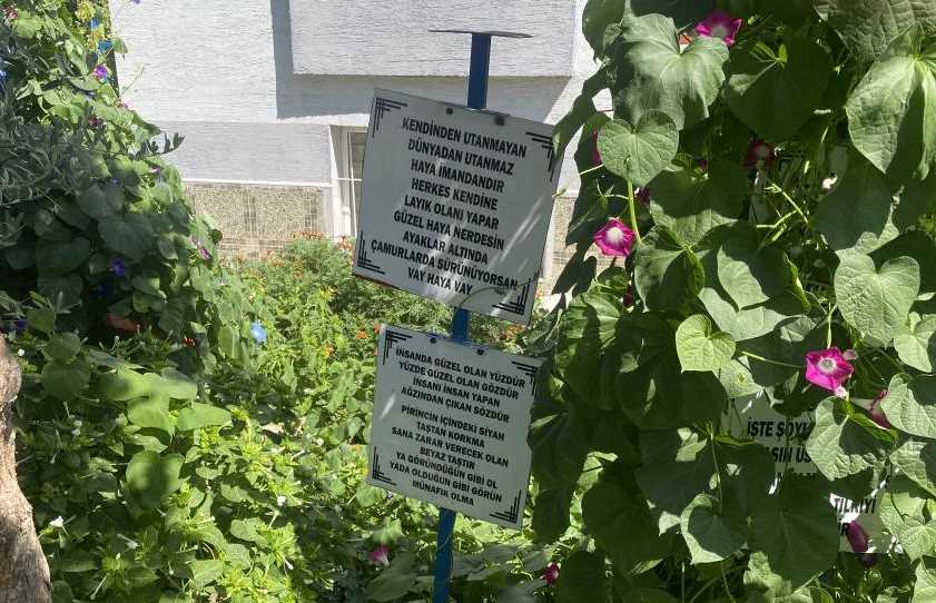 Bahçenin dört bir yanına yerleştirilen yazılar, kısa ama anlam yüklü cümlelerden oluşuyor. “Mecliste arif ol, kelamı dinle. El iki söylerse, sen birini söyle. Elinden geldikçe iyilik eyle. Darılıp da başa kakıcı olma” gibi nasihatler, özellikle güzel ahlak ve toplumsal huzura dikkat çekiyor.