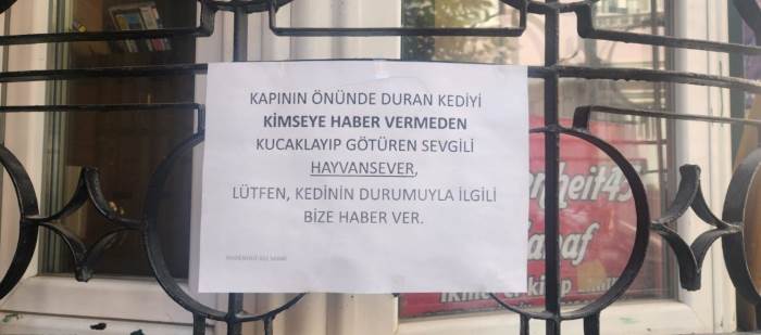 Eskişehir’de bir sahafının vitrin camına astığı yazı dikkat çekti. Dükkanın önünde kendi imkanlarıyla baktığı kedinin kaybolduğunu fark eden esnaf, kediyi götüren kişilere sitemde bulundu. “Kapının önünde duran kediyi kimseye haber vermeden kucaklayıp götüren sevgili hayvansever. Lütfen bize kedinin durumuyla ilgili haber ver” yazısı ile kaybolan kedi hakkında bilgi edinmek istediğini  belirten sahafının, ‘hayvansever’ kelimesinin altını çizmesi ise ironi yaptığını düşündürdü.