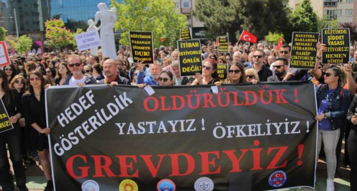Sendikalar adına açıklamada bulunan Özel Sektör Öğretmenleri Sendikası Temsilcisi Yücel Karasu, Bakanlığın, siyasi iktidarın eğitim çalışanlarına yönelik söylemleri ve Öğretmenlik Meslek Kanunu ile emeği değersizleştirdiğini söyledi. Öğretmenlik mesleğinin itibarsızlaştırıldığının altını çizen Karasu, “Bu da beraberinde mesleğimizin itibarsızlaştırılmasını, savaşlarda bile hedef alınmayan eğitim emekçilerinin okullarda şiddetin hedefi olmasını doğurdu. Son bir ayda hamile arkadaşımızın dövülmesinden, bıçaklı yaralamaya, okula silahlı saldırıya kadar birçok şiddeti beraberinde getirdi. En sonunda da bir arkadaşımızın hayatını kaybetmesine neden oldu” dedi.