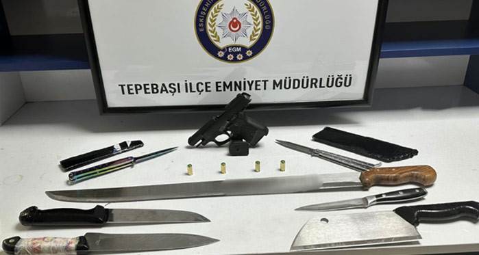 Eskişehir’de iki grup arasında çıkan tartışma üzerine bölgeye sevk edilen polis ekiplerince alanda yapılan incelmelerde 7 kesici alet ve 1 ruhsatsız kurusıkı tabanca bulunurken, materyallerin sahiplerine yönelik işlem başlatıldı. Tepebaşı İlçesinde bulunan bir parkta kalabalık grubun toplandığı anonsu üzerine bahse konu noktaya Tepebaşı İlçe Emniyet Müdürlüğü bağlı Yaya Devriye Ekipleri sevk edildi. Kendi aralarında tartışan şahıslarla karşılaşan ekipler duruma müdahale etti. Şahıslar, birbirlerinden şikâyetçi olmadıklarını beyan ettiler. Park çevresindeki ağaçların yoğun olduğu bölgede keşif yapan ekipler;  1 kurusıkı silah ve 4 fişek ile 7 kesici alet buldu.