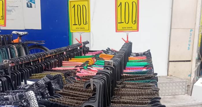 Eskişehir’de Hamamyolu Caddesi’nde tezgâhlarda 100 liradan satışa sunulan eşofmanlar, yoğun yaya trafiğinin yaşandığı bölgede fiyat etiketiyle dikkat çekti.