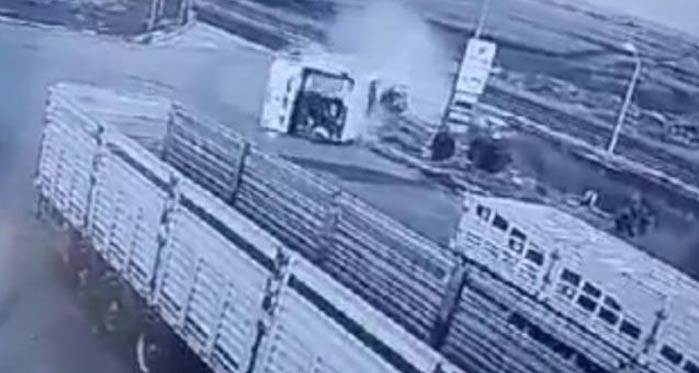 Kazada, otomobille çarpışan otobüs kontrolden çıkarak yan yattı. Metrelerce sürüklenen otobüs, iş yeri önünde park halindeki tıra çarparak durdu. Yaşanan feci kaza bir iş yerine ait güvenlik kamerasına yansıdı.