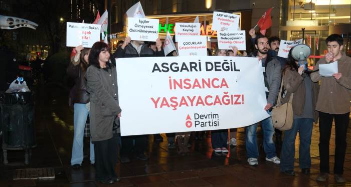 Devrim Partisi, asgari ücretin 28 bin 75 lira olarak açıklanarak açlık sınırının altında belirlenmesine tepki göstermek amacıyla İsmet İnönü Caddesi’nde bir AVM önünde bir araya geldi. “AKP'nin ipleri patronların elinde”, “Çocukların katili sermayenin düzeni” sloganları eşliğinde yapılan açıklamada Devrim Partisi adına konuşan Ahmet Alabay, belirlenen asgari ücretin emekçilerin insanca yaşam koşullarından uzak olduğunu ve sermaye düzeninin bir sonucu olarak dayatıldığını söyledi. Devrim Partisi adına konuşan Alabay, açlık sınırının altında belirlenen asgari ücretin, iktidarın emperyalistler için çalıştığının ve emekçilere düşman olduğunun yeni bir kanıtı olduğunu ifade ederek, “Rasyonel ekonomi politikaları adı altında emek düşmanlığı yapan ve emekçilerin ücretlerinin enflasyona ezdirilmesine çanak tutan tüm siyasetçiler ise bu suçun ortağıdır. Bizim kendimizden başka gücümüz yok. Verdiğimiz emeğin karşlığını alabilmek için birlikte mücadele dışında yol yok. Emekçi halkımızı, sömürüye son vermek için birlikte mücadeleye çağırıyoruz. Asgari ücret bunun yalnızca bir boyutu. Biz artık yurttaş değil köle, teba olarak görülüyoruz. Biz yurttaşız. İnsan gibi yaşamak hakkımız. Yaşamak için ihtiyaç duyduğumuz her şeye onlarca kat zam gelirken her yıl gerçek enflasyonun çok altında kalan güncellemeleri kabul etmiyoruz. Türkiye’nin kaynakları hepimizin rahat bir yaşam sürebilmesi için yeterli. Bundan sonra patronlar için değil kendimiz için çalışmak istiyoruz. Ölümle burun buruna çalışmak zorunda değiliz. Her yıl binlerce işçinin iş sırasında ölmesini kaderimiz olarak kabul etmiyoruz. Sırf zenginler daha çok kazansın diye bir kişiyi daha ölüme göndermeyeceğiz. Kaza adı verilen iş cinayetlerinin tarihe karışması için gereken önlemler lüks değil hakkımızdır” diye konuştu.