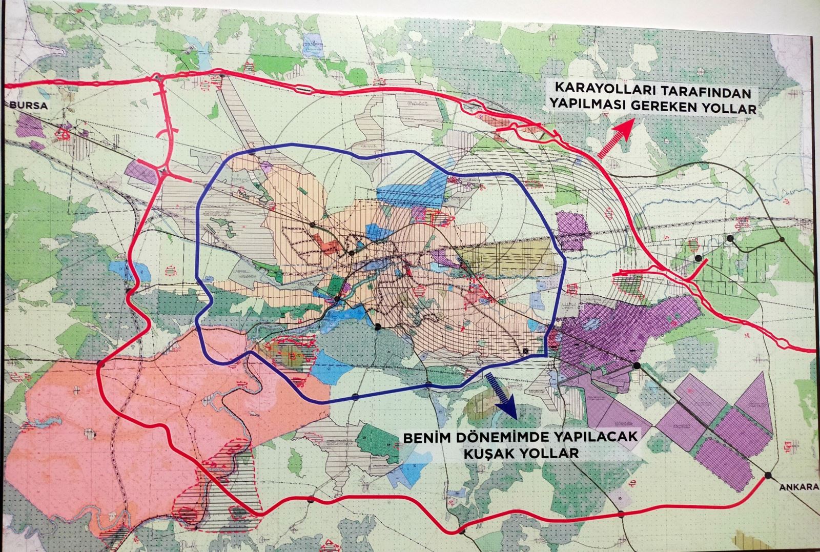 Belediye olarak hazırlanan kuşak yolları projesini hayata geçireceklerini açıklayan Ünlüce, “Kırmızı ile gördüğümüz Karayolları Genel Müdürlüğü tarafından yapılması gereken yollar. Bu yolları 25 binlik plana işlemiştik. Biz 2016 yılında bu planları yaparken maviyle işaretlediğimiz kuşak yollar yaptık. Kuzey ve güneyi sarıyor. Çevre yoluyla beraber Bursa tarafından geliyor, yukarı doğru kırılıp havaalanı ile Muttalıp’ın arasında kalan noktadan geçerek sanayi bölgesine iniyor. Güney kuşak yolu ise, Vadişehir ve Ihlamurkent’in altından dolanarak TEKSAN’ın oradan çıkıyor. Orada ciddi bir trafik yoğunluğu var. Biz bu yolu çevre yolu yapılır düşüncesiyle, kamu kaynaklarını buraya harcamayalım diye düşünmüştük. Öncelikli yolları yapmayı düşündük. Özellikle bu sene de yatırım programına alınmayınca biz artık bu yolları yapmaya karar verdik. Önümüzdeki dönemde ben kazandıktan sonra da hemen yazışmalarını tamamlayıp bu yolları yapmaya başlayacağız. Çift şeritli yapacağız. Hatta belki bunun etrafında, yer vermek çok doğru değil ama OSB’ye olan trafiği de besleyeceği için ileride sosyal konut alanları yaratabiliriz. Bizim en büyük sıkıntılarımızdan bir tanesi batıdan doğuya sabah ve akşam yaşanan OSB trafiği. Bunu da belki, bu noktalarda sosyal konut alanları planlayarak çözebiliriz. Trafiği çözmek anlamında çok önemli gelişme olacak şehir adına. Şehri transit geçmek isteyen birisi artık şehre hiç uğramayacak. Çevre yolunu hiç kullanmayacak artık. Aynı zamanda OSB’de çalışan ya da bu aksı kullanacak hiç kimse de şehrin içine girmemiş olacak ve ciddi şekilde trafiği rahatlatacak. Arada bağlantı noktalarını da planlayarak şehrin merkezine girmeden trafiği rahatlatacağını düşünüyoruz. Bürokratik yazışmaları, planlamaları bittikten sonra 1 yılda yapabileceğimiz bir yol. Biz buna benzer yolları yaptık, bunu da süratle yaparız. Bizim çok rahat yapabileceğimiz bir yol. Yeter ki yazışmaları bitirelim” dedi.