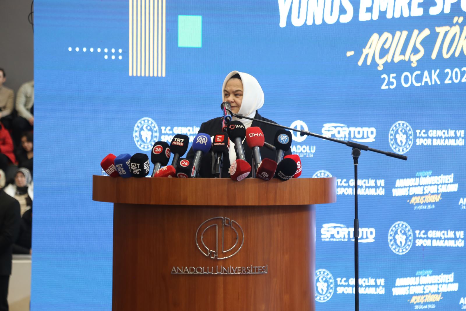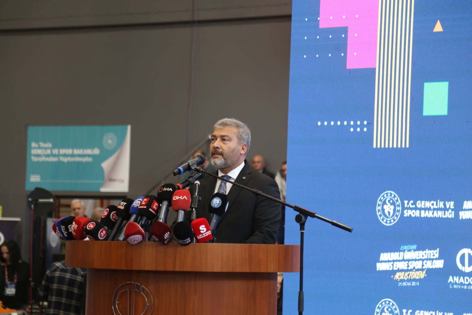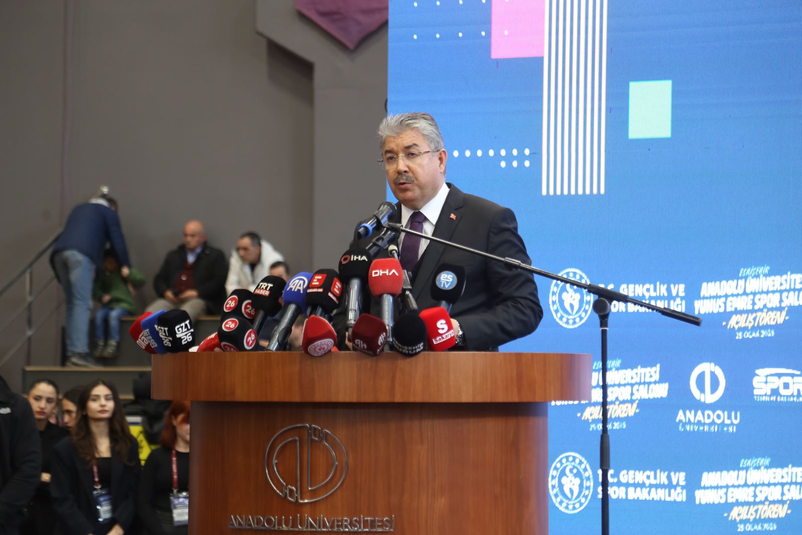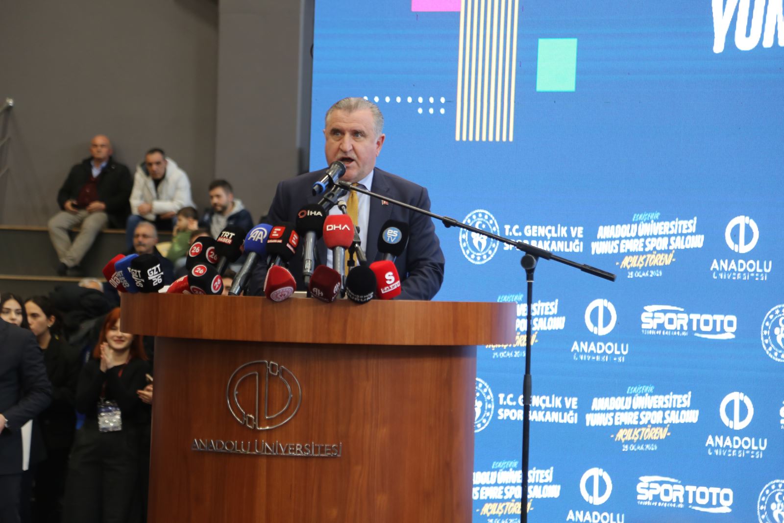 Anadolu Üniversitesi Rektörü Prof. Dr. Yusuf Adıgüzel yaptığı konuşmada, “Anadolu Üniversitesi olarak sadece akademik bilgiyle sınırlandırmayan; öğrencilerin fiziksel, sosyal, sportif gelişimlerini bir bütün olarak ele alan bir anlayışla çalışmalarımızı sürdürüyoruz. Bu anlayış doğrultusunda bugün açılışını yaptığımız Yunus Emre Salonu, öğrencilerimizin spora erişimini kolaylaştıracak, sağlıklı yaşam kültürünü geliştirecek ve kampüs yaşamını daha nitelikli hale getirecektir. 2025-2026 eğitim öğretim yılını Yunus Emre Yılı ilan etmiştik ve bugün açılışını yaptığımız bu güzel spor tesisinin adı da Yunus Emre Spor Salonu. Bu vesileyle başta Sayın Bakanımıza, Sayın Valimize, şehrimizin çok değerli milletvekillerine ve emeği geçen bütün kurum, kuruluş ve paydaşlarımıza bir kez daha çok teşekkür ediyorum. Yunus Emre Spor Salonu'nun üniversitemize, öğrencilerimize, şehrimize ve ülkemize hayırlı olmasını diliyor; hepinizi sevgi ve saygıyla selamlıyorum” dedi.