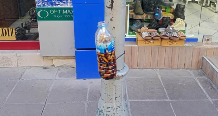 Caddenin bu bölümünde tekstil ve ayakkabı mağazalarının yan yana yer alması nedeniyle gün boyunca yoğun bir yaya trafiği yaşanıyor. Plastik şişenin bu şekilde kaldırıma bırakılması, hem çevre temizliğini olumsuz etkiliyor hem de kent estetiğiyle uyumsuz bir görüntü ortaya koyuyor.