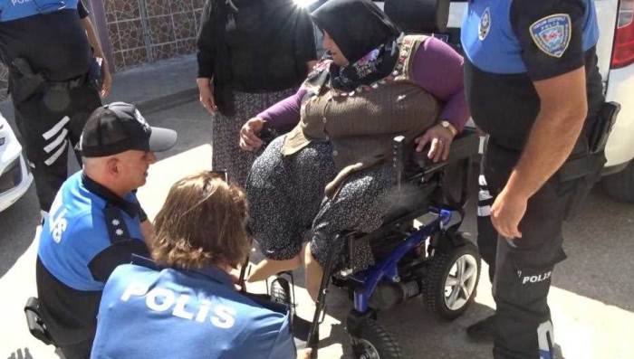 Polisler yeni tekerlekli sandalyesini engelli kadına teslim etti