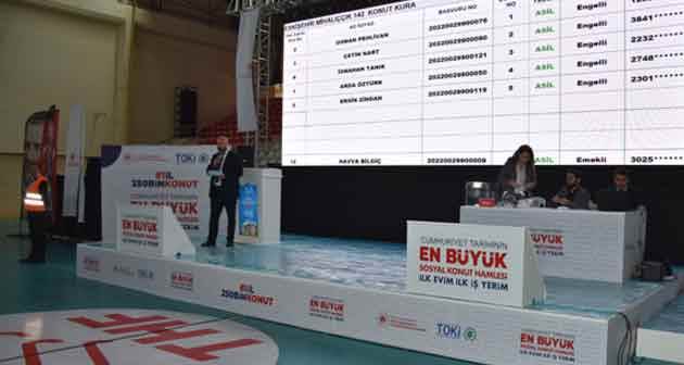 Kura çekimi, 1193 başvuru arasından konut hak sahiplerini belirlemek amacıyla Toplu Konut İdaresi Başkanlığı (TOKİ) yetkililerince Porsuk Spor Salonu'nda yapıldı. Seyitgazi ilçesinde 88, Günyüzü'nde 120, Mahmudiye'de 98, Sarıcakaya 63 ve Mihalıççık'ta 142 olmak üzere 511 konutun hak sahipleri kura sonucu belli oldu. Kura çekimini Seyitgazi ilçesinde inşa edilecek olan konutlar için takip eden Turan Özden, heyecanla sonuçları beklediklerini söyledi. Kiracı olduklarını belirten Özden, "Olursa olur, olmasa da yapacak bir şey yok. Çıkarsa mutlu olacağız. Herkese hayırlı olsun." dedi. Eskişehir kent merkezinde inşa edilecek 1800 konut için kura çekimi dün gerçekleştirilmişti.