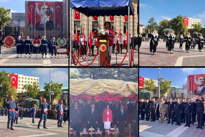 Tören Eskişehir Valisi Hüseyin Aksoy, Muharip Hava Kuvveti Komutanı Hava Orgeneral İsmail Güneykaya ve Eskişehir Büyükşehir Belediye Başkanı Ayşe Ünlüce'nin çelenk sunumu ile başladı. Saygı duruşu ve İstiklal Marşı'nın okunmasıyla devam eden törene CHP Milletvekili İbrahim Arslan, AK Parti Eskişehir İl Başkanı Gürhan Albayrak, Odunpazarı Belediye Başkanı Kazım Kurt ve Tepebaşı Belediye Başkanı Ahmet Ataç katıldı.