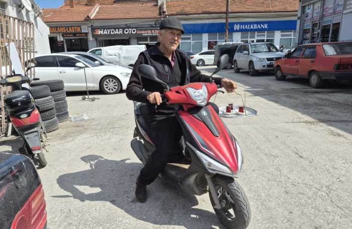 Eskişehir’de 44 yıldır çay ocağı işleten 72 yaşındaki Cahit Çandemir, hem azmi hem de ilginç çalışma yöntemiyle dikkat çekiyor. Küçük Sanayi Bölgesi’nde esnafa ve müşterilerine hizmet veren Çandemir, işini kolaylaştırmak için elektrikli motosiklet kullanarak çay servisi yapıyor.