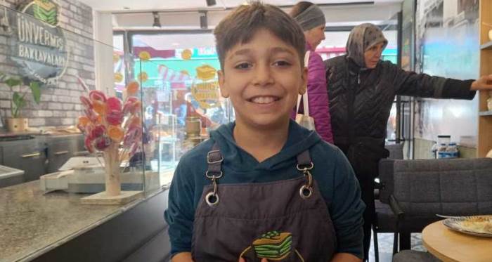 Eskişehir’de ailesine ait tatlıcı dükkanında önlüğünü giyerek satış yapmaya çalışan 8 yaşındaki ilkokul öğrencisi Emre Dumanlıdağ, görenlerin sevgisini kazanıyor.