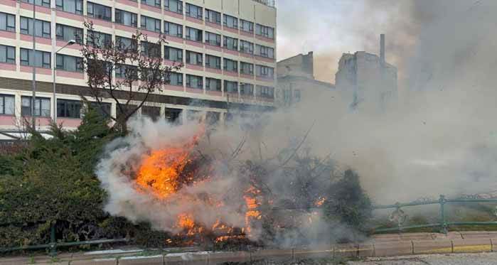 Eskişehir’de Cengiz Topel ile İki Eylül caddelerinin kesiştiği Eskişehir Subay Orduevi‘nin önünde bulunan yeşillik alandaki süs ağaçlarında yükselen alevler, rüzgârlı havanın da etkisiyle dakikalar içinde büyüdü. Tramvay seferleri yangından dolayı dururken, hattın kablolarına kadar yükselen alevler vatandaşlarda paniğe neden oldu. Çevredeki vatandaşlar alevlerin büyümemesi için yangın tüpü, belediye görevlileri ise çim sulama sistemleri ile ateşe müdahale ettiler. Kısa sürede vatandaşlar ve belediye görevlilerince kontrol altına alınan alevler için itfaiye ekipleri soğutma çalışması yaptığı görüldü. Yangında şans eseri yaralanan olmazken, bazı vatandaşların yoğun dumandan etkilendiği görüldü. Yangından dolayı aksayan tramvay ve araç trafiği de normale döndü.