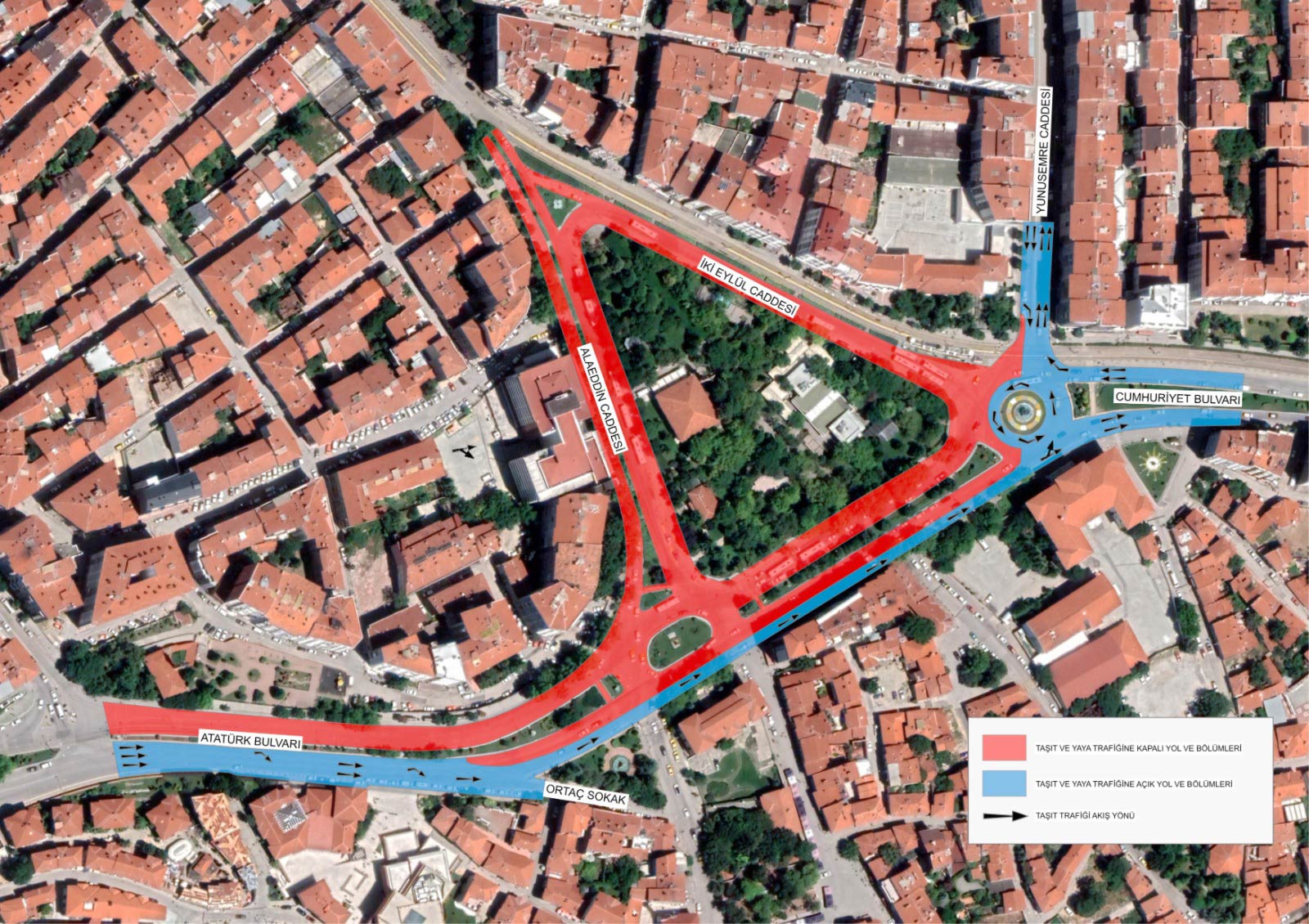 Eskişehir Büyükşehir Belediyesi konuyla ilgili şu bilgilere yer verdi: “Tarihi Odunpazarı Bölgesi’nde gerçekleştirdiğimiz kavşak ve trafik akışı düzenlemesi kapsamında 2. etap çalışmalarımız 24 Temmuz Pazartesi günü başlıyor. Çalışmalarımız trafik yoğunluğunun olmadığı 22.00-06.00 saatleri arasında yapılacak olup, görselde kırmızı ile işaretlenmiş alanlar araç trafiğine kapatılacaktır. Bu çerçevede Atatürk Bulvarı'ndan Cumhuriyet Bulvarı yönüne trafik tek şeritten sağlanacak, Cumhuriyet Bulvarı-Atatürk Bulvarı yönü ise trafiğe tamamen kapalı olacaktır. Bu güzergâhı kullanmak isteyen sürücülerimizin Cumhuriyet Bulvarı-Yunus Emre Caddesi-İbrahim Karaoğlanoğlu Caddesi-Süleyman Çakır Caddesi-Atatürk Caddesi-Atatürk Bulvarı istikametini tercih etmeleri önemle rica olunur.”