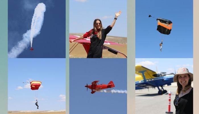 Paraşütçüler, Türkiye'nin tek sivil profesyonel kadın akrobasi pilotu Semin Öztürk Şener'in "Yeni Menekşe" adlı uçağıyla yaptığı akrobasi gösterisini de izledi.