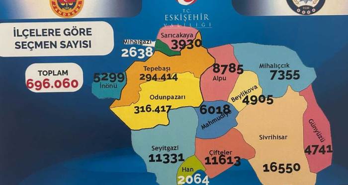 Eskişehir’de en fazla seçmenin ve sandığın yer aldığı ilçe Odunpazarı ilçesi oldu. 316 bin 417 seçmenin bulunduğu Odunpazarı İlçesinde 978 sandık kurulacak. Odunpazarı’nı ikinci sırayla takip eden Tepebaşı İlçesi oldu. Tepebaşı’nda294 bin 414 seçmen 914 sandıkta oyunu kullanacak. Üçüncü sırada ise 16 bin 550 seçmen ve 97 sandıkla Sivrihisar geliyor. Sivrihisar’ı sırasıyla 11 bin 613 seçmen ve 51 sandıkla Çifteler, 11 bin 331 seçmen ve 69 sandıkla Seyitgazi, 8 bin 785 seçmen ve 45 sandıkla Alpu, 7 bin 355 seçmen ve 59 sandıkla Mihalıççık, 6 bin 18 seçmen ve 31 sandıkla Mahmudiye, 5 bin 299 seçmen ve 24 sandıkla İnönü, 4 bin 905 seçmen ve 29 sandıkla Beylikova, 4 bin 741 seçmen ve 26 sandıkla Günyüzü, 3 bin 930 seçmen ve 19 sandıkla Sarıcakaya, 2 bin 638 seçmen ve 11 sandıkla Mihalgazi, 2 bin 64 seçmen ve 17 sandıkla Han ilçesi takip ediyor.