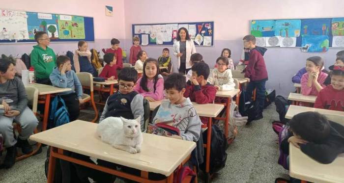 Eskişehir’deki bir ilkokulda yaşayan ve okul personeli tarafından beslenen 6 yaşındaki Çakıl isimli kedi, her gün öğrencilerle birlikte sınıflara giriyor ve ders dinliyor.