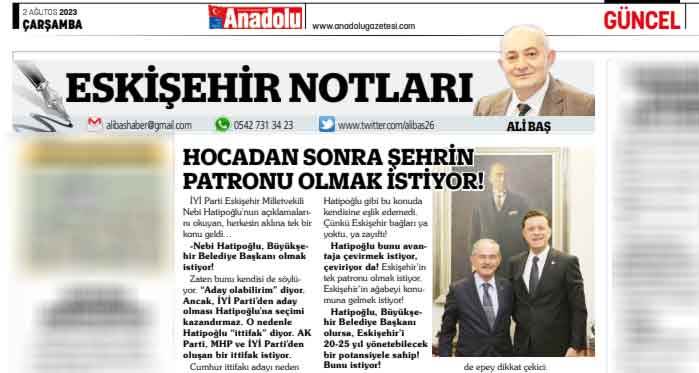Eskişehir gündemi, İYİ Parti Eskişehir Milletvekilliği'nden istifa eden Nebi Hatipoğlu ile çalkalanırken, Anadolu Gazetesi'nde tam 3 ay önce yayınlanan yazı akıllara geldi. Yazarımız Ali Baş, yazısının başlığında "Hocadan sonra şehrin patronu olmak istiyor" derken, yazının ilk satırları da şu şekildeydi;