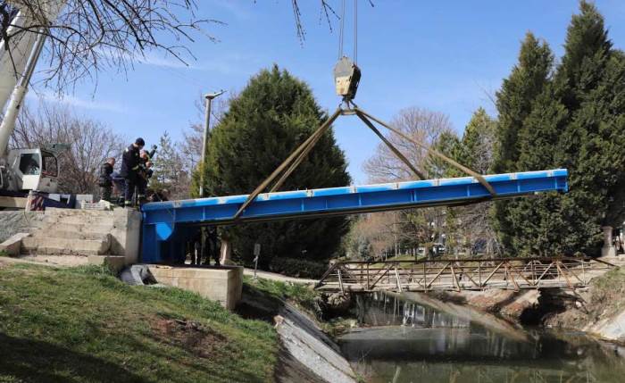 Büyükşehir Belediyesi Fen İşleri ve Park ve Bahçeler Daire Başkanlığı ekipleri, geçtiğimiz yıl hizmete açılan ve kısa sürede Eskişehirlilerin uğrak noktalarından biri haline gelen İskele 26’ya giden mevcut köprünün dar olması ve yoğun yaya trafiğini karşılayamaması nedeniyle daha geniş ve dayanıklı bir köprü inşa ediyor.