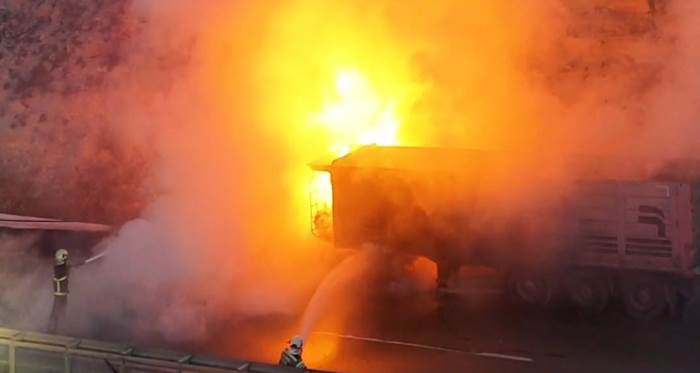 Kütahya-Eskişehir karayolunun 27. kilometresinde, cam kumu yüklü bir tır seyir halindeyken alev aldı. Sürücü, yükselen dumanları fark ederek tırı yol kenarına çekti ve durumu 112 Acil Çağrı Merkezi’ne bildirdi.