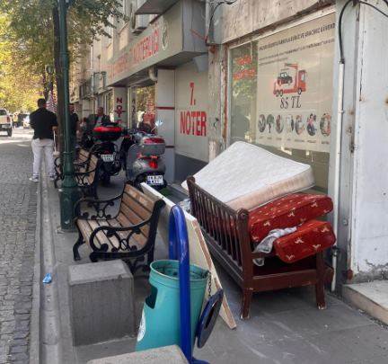 Eskişehir'in merkezinde, sokağa bırakılan eski koltuk ve yataklar, çevredeki esnaf ve vatandaşların tepkisini topladı.