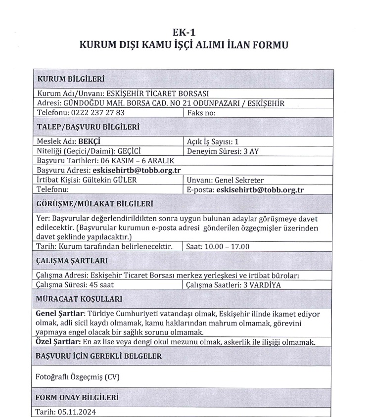 Eskişehir Ticaret Borsası, 25 Kasım 2024 tarihi itibarıyla geçici statüde çalışacak bir bekçi alımı için başvuruları kabul etmeye başladı. Alım, 6 Kasım - 6 Aralık 2024 tarihleri arasında yapılacak olup, başvurulara ilişkin detaylar şu şekilde duyurulmuştur.