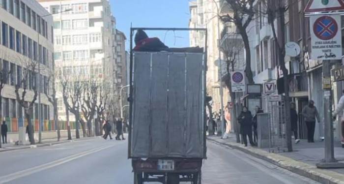 Eskişehir'de hiçbir önlem almadan üç tekerlekli motosikletin kasasındaki yüklü kartonların üzerine çıkıp yolculuk yapan şahıs trafiği tehlikeye attı.