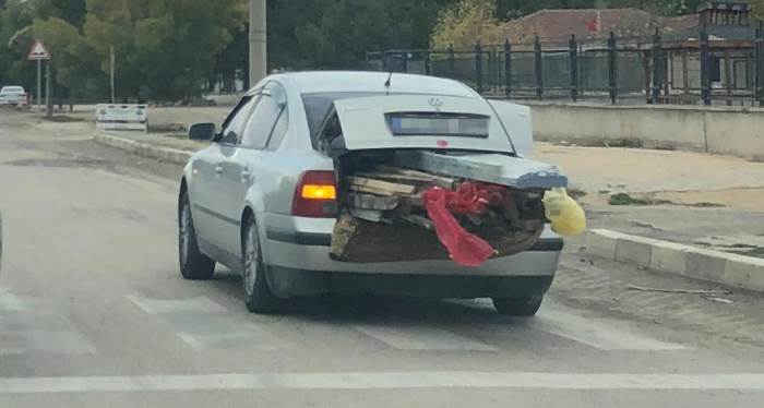 Eskişehir’in Alpu ilçesinde bir otomobilin bagajına yüklenen kereste ve inşaat malzemeleri, trafikte ciddi tehlike yarattı.