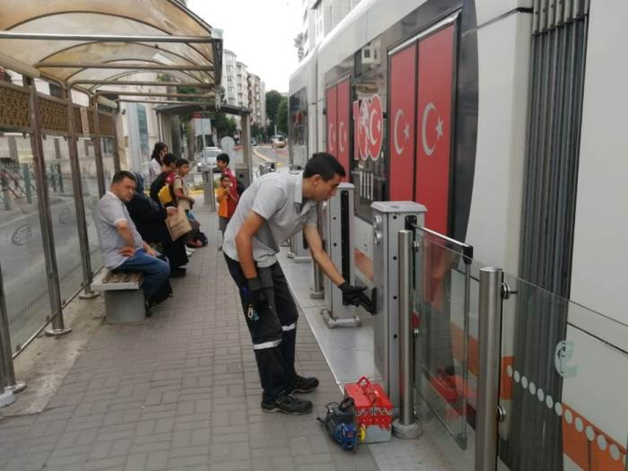 Eskişehir’de karşılıklı yolcu taşımacılığı yapan tramvay duraklarında bakım çalışması başlatıldı. Hafta sonu sabah erken saatlerde Büyükşehir Belediyesi ESTRAM, teknik ekibi tarafından başlatılan çalışmada tüm duraklarda tramvaya açılan kapılar başta olmak üzere giriş ve çıkış turnikeleri elden geçirildi. Konu ile ilgili verilen bilgilere göre, zamanla arızalanan ve tramvaylara binişi ve inişlerde sorun yaratan kapılar başta olmak üzere turnikelere aylık bakımın yapıldığı öğrenildi. Yetkililer, şehir içi ulaşım aracı olan tramvayda vatandaşların sorun yaşamamaları için belirlenen gün ve saatlerde teknik ekip tarafından gerekli bakım çalışmasının yapılacağını söylediler.Otogar-SSK,Otogar- OGÜ,Otogar-Kumlubel ile Ring hattı duraklarında arızalanan kapılar ile turnikelerdeki sorununun da giderildiği bildirildi.