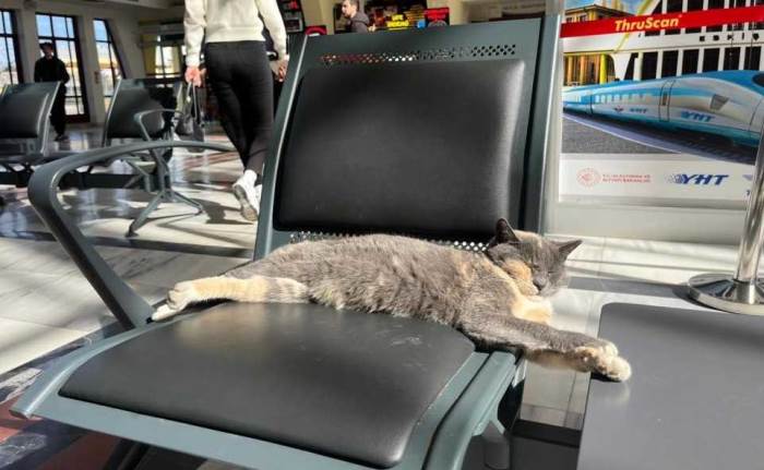 Soğuk havadan kaçan sevimli bir kedi, tren garı bekleme salonunda bulduğu koltukta güneşin tadını çıkararak uykuya daldı. Yolcuların yüzünde tatlı bir gülümseme bırakan bu anlar, garın neşeli anlarından biri oldu.