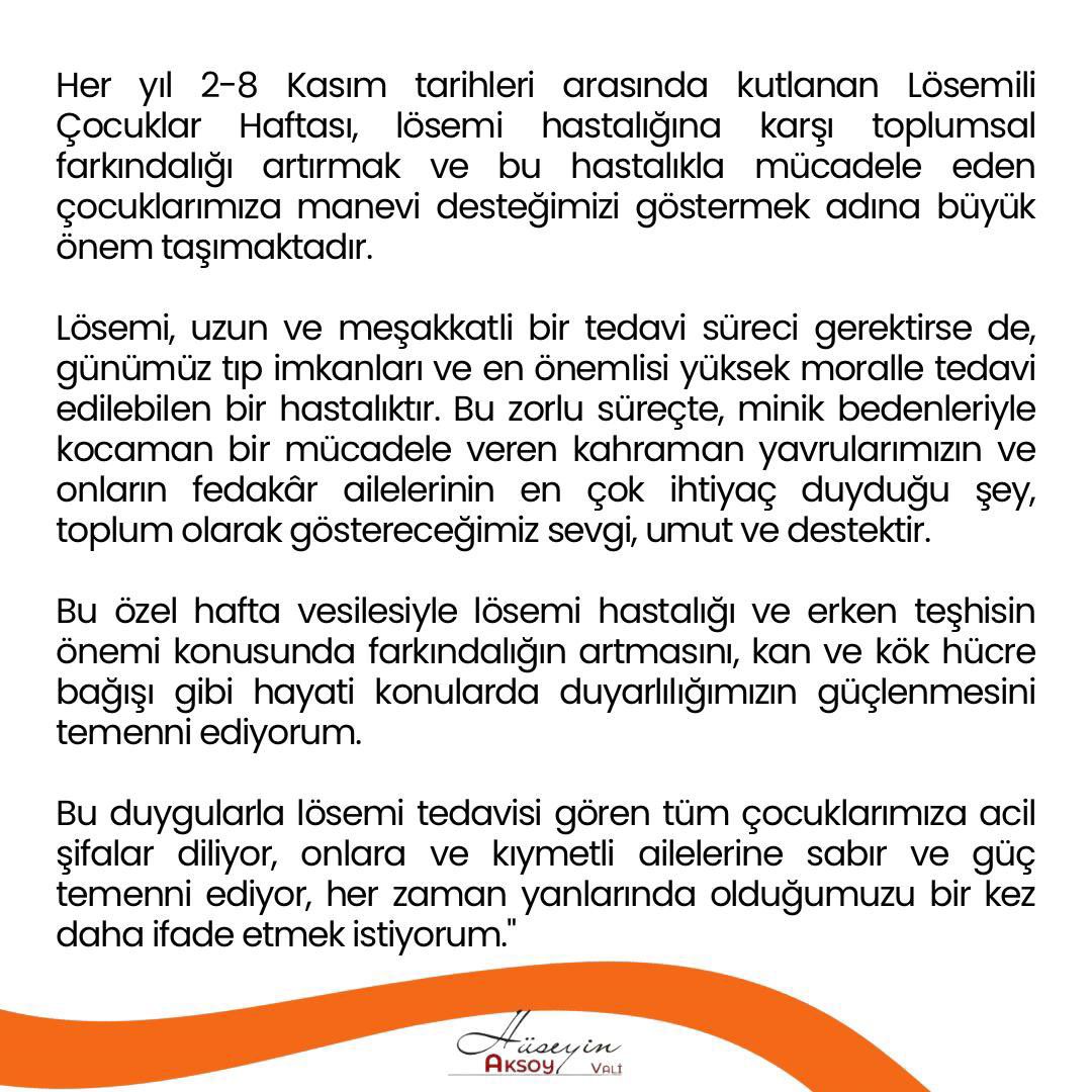 Lösemiye karşı farkındalığın artmasının önemine değinen Aksoy, erken teşhisin ve kök hücre ile kan bağışının hayati rol oynadığını vurguladı. Vali Aksoy, “Lösemi tedavisi gören tüm çocuklarımıza acil şifalar diliyor, onların ve ailelerinin yanında olduğumuzu bir kez daha ifade etmek istiyorum” sözleriyle mesajını tamamladı.