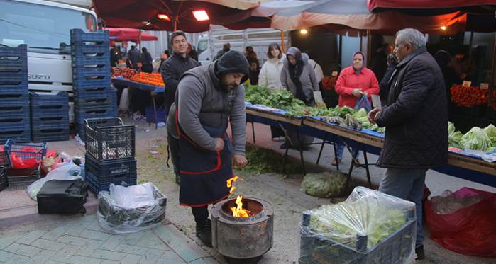 Mustafa Doymaz: “Gördüğünüz gibi hava şartları olumsuz. Kapalı Pazar olsa hem müşteriler için hem esnaflar için çok güzel olur ama maalesef arkadaşlarımız böyle ısınmaya çalışıyor. Hava ayaza çektiğinde de ürünlerin hepsi dönecek. Burada esnaflar hem müşteri gelmediği için hem de ürünleri donduğu zarar ediyor. Bu iş yetkililerin birlikteliğiyle çözülebilir.”