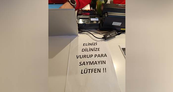 İki Eylül Caddesi'nde bulunan işletme sahibi, müşterilerin paraları sayarken ellerini ağızlarına götürerek ıslatmalarının hijyen açısından zararlı olduğunu düşünerek bu adımı attığını belirtti. Esnaf, gelen vatandaşların sayısının her geçen gün arttığını ve bu nedenle bu sorunla sık sık karşılaştıklarını belirtti. İşletme sahibi, "Elinizi dilinize vurup para saymayın" şeklindeki uyarıyı kasasına asarak müşterilerine hijyen konusunda dikkat çekmeye çalıştı.