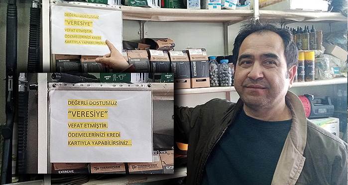 Geçmiş yıllardan bu yana esnaf dükkânlarında bir kültür haline veresiye her geçen gün azalıyor. Müşterilerin borç paralarını ödememesi sebebiyle peşin ödeme yapılmasını isteyen pek çok esnaf, pandemi döneminden sonra kullanımı daha da yaygınlaşan kredi kartları ile taksit yapılabilmesi nedeniyle veresiye sistemini kaldırdı. Bu işletme sahiplerinden birisi olan Mithat Gelici ise, kasanın arkasına yapıştırdığı 'Değerli dostumuz veresiye vefat etmiştir. Ödemelerinizi kredi kartıyla yapabilirsiniz' yazılı mesajı ile görenleri güldürdü.